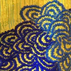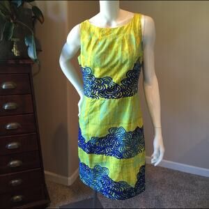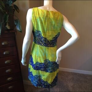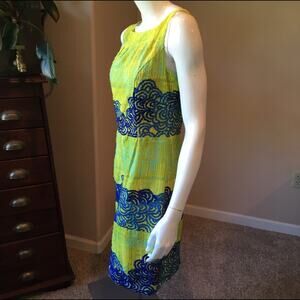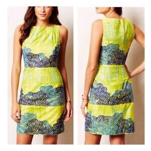 Tabitha Anthropologie 4 lovely azure scroll dress. Stunning yellow green background with swirls of blue embroidery. Stand out in this dress at your next summer event. Dress is in perfect condition