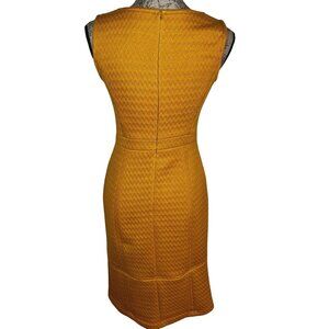 Polished and curve-hugging, this Anthropologie Tabitha sheath dress features a rich mustard chevron-textured fabric with a fitted hourglass silhouette.