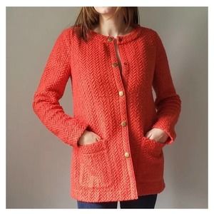 Details: From Anthropologie. Overcoat jacket in a red orange color. Herringbone chevron knit pattern. Round neck, dual pockets, snap button closure. 52% wool, 48% polyester.