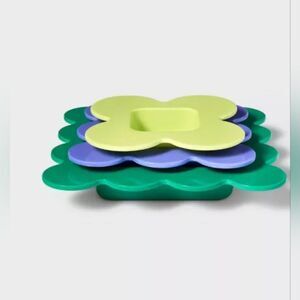 Set of three flower stacking snack trays in green, lime, and purple. Perfect for adding a pop of color to your table setting.