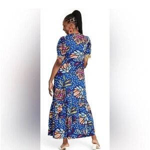 Bright blue maxi dress with colorful floral patterns. Features short sleeves and a flowing design.