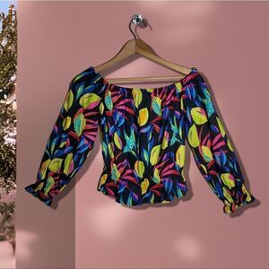 Love your look in this Lemon Print Bardot Top from Tabitha Brown for Target. This off-the-shoulder top features a wide elastic neckline, as well as three-quarter raglan sleeves trimmed in ruffle detail. The relaxed-fit design features additional ruffle trim on the at-waist hemline, and an allover pattern of bright lemon print contrasts with the black fabric background. Tabitha Brown brightens days like no one else.