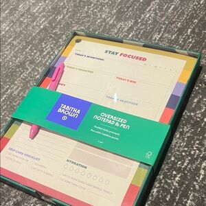 Organize your day with the Tabitha Brown notepad and pen. Features colorful sections for priorities and gratitude.