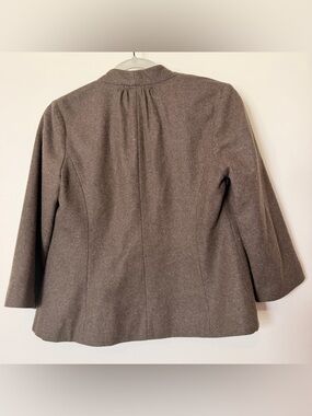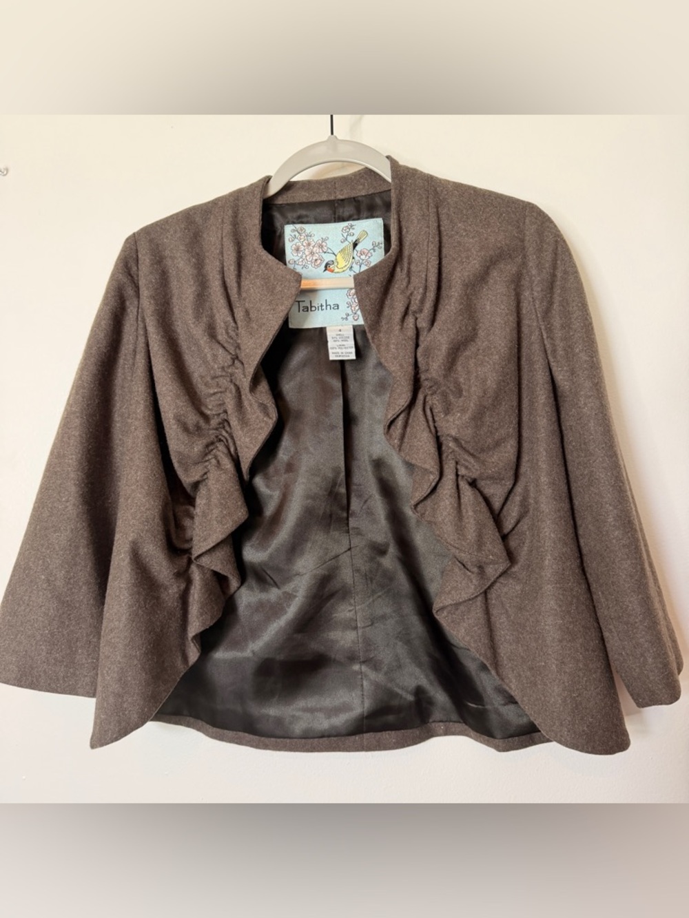 Soft draped blazer with cascading ruffle trim. Open-front silhouette. Smooth satin-like interior lining. Feminine and versatile for dress or casual outfits.