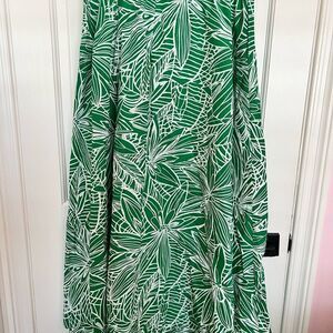 Elegant maxi skirt with a vibrant green and white leaf pattern. Button-down front adds style.