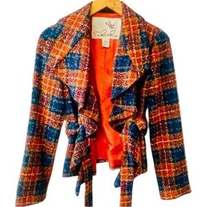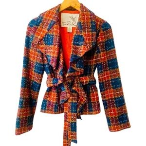You are viewing a listing for a beautiful multicolor ruffled boucle wrap jacket by Tabitha, size 2. Measures approximately 34" in bustline, 28" in length and 24" in sleeves. Very good condition. Smoke-free environment.