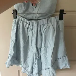 Stylish light blue two-piece set with a cropped top and matching shorts. Perfect for casual outings. Great condition only worn once or twice