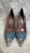 Elegant heels with a vibrant blue floral pattern. Accented with silver details. Perfect for adding flair to any outfit.