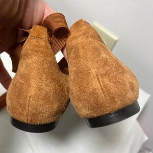 Beautiful suede upper ballet flat with attached ankle wrap ribbons. Quiet luxury brand at a less than luxury price. A few small and light discolorations to suede and sole wear only signed of wear. See pix. Perfect to pair with a dress of your choosing or to dress up crops or tights.