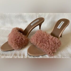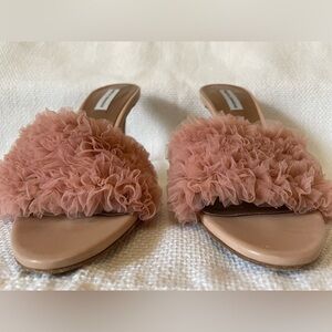Chic blush pink heels with ruffle detail. Perfect for adding elegance to any outfit. Uppers in very good to excellent used condition. Soles show wear but lots of love left to give !