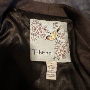 Elegant and feminine Tabitha wool-blend jacket in a rich chocolate brown. Features a soft ruffle-trimmed open front, lightly ruched detailing, and three-quarter sleeves. Fully lined with Tabitha’s signature embroidered label and satin interior. Made with a high-quality fabric blend for warmth and structure — perfect for layering over blouses or dresses.