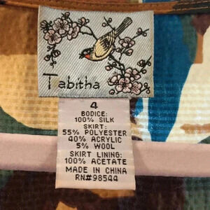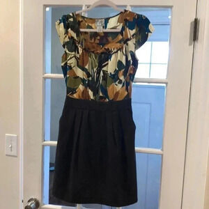 Tabitha cap sleeve silk/polyester/cotton dress with side zipper and pockets. Brown bottom with silk cream top with floral design. Size 4