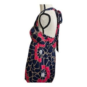 Tabitha womens silk blouse halter neck tie zipper on side. Blue pink floral size 6 baby doll style.