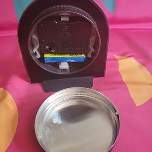 Silver color table Quartz clock with Roses 🌹 design on clock. Turn back cover to left or pull and it opens where you can change the time or replace AA battery. New battery included