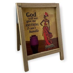 Quote And Inspirational Religious Phrase with Lady in Traditional African Print Dress and Headwear on one side and Chalkboard on the other side. Chalk not included.