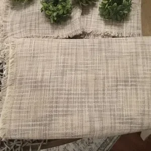 Matching set. Never used or washed, display only. small stain on direct center of Runner from a marker. I placed a floral centerpiece over it and wasn't noticeable. lots of life left.