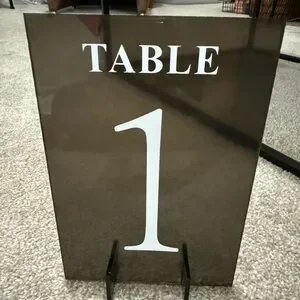 Acrylic table signs 1-19. Acrylic is a smokey grey/black. Lettering is white. Used once for our wedding on July 21st. Comes with stands as pictured.