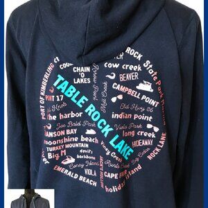 Lake hoodie, size women's petite large, with Table Rock Lake graphics containing names of various marinas and landmarks. This is a recycled navy zip-up sweatshirt hoodie to which pink and teal TRL graphics have been applied. This sweatshirt would make a great unique gift for any TRL enthusiast!