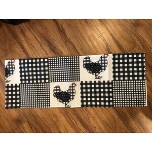 This listing is for a Table Runner 13x72in Black and White Chickens Woven Polyester. Machine wash on cold.