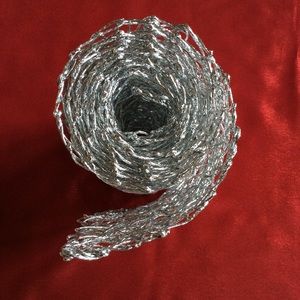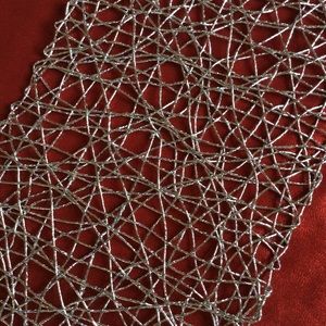 Beautiful silver table runner will add sparkle to your holiday or special event table. Pliable material can be rolled up for easy storage. Never used. Plates & glassware for display only