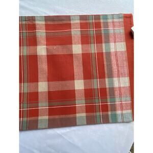 Table Runner, Made in India, Beautiful quality / thickness in vibrant pumpkin / paprika Orange on one side and plaid on the other with shades of orange, sage green and white. 13 in X 72 in. 100% Cotton Machine Wash / Line Dry / Iron if necessary. Excellent pre-owned condition.