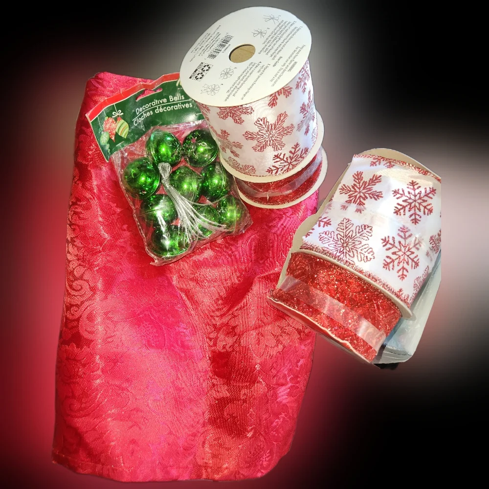 A table runner, 4 rolls of wired ribbon of 2 widths, and a bag of jingle bells in pack for hanging/project etc.