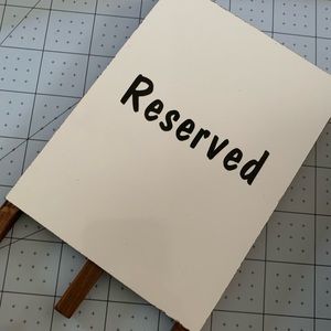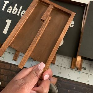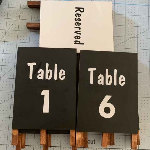 There are a total of 8 signs. There are 2 “Reserved” signs & table numbers 1-6. All are on easels. Table numbers are white on black & the reserved signs are the reverse.