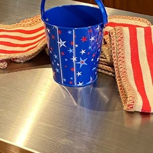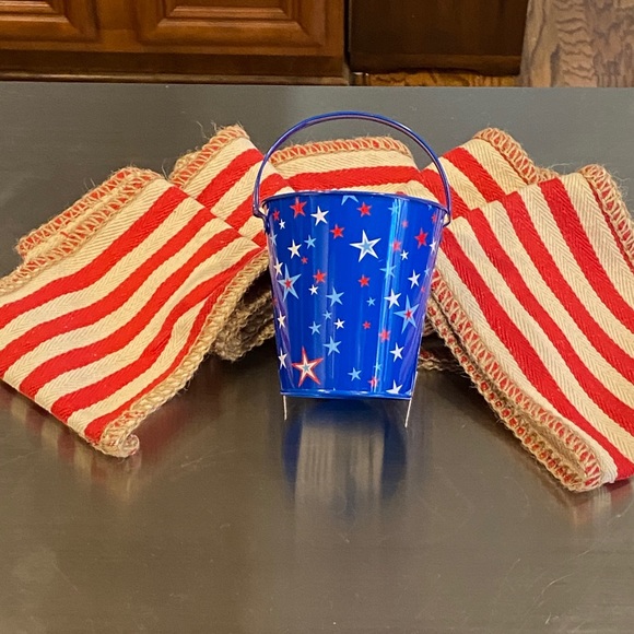 Red white and blue metal bucket, 4 inches across the top and 4 1/4 inches high without handle, 6 1/4 inches with handle tall. Red and white stripe table runner. Approx 106 inches long, 6 inches wide. Non smoking non pet home. Cute on a 4th of a July table.