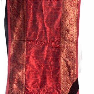 Saree border recycled silk table runner. Beautiful fabric and pattern, sure show stopper in any room. Length 5 ft 11 inches and width approx 6 inches .. sorry I didn’t have a big table to display this !