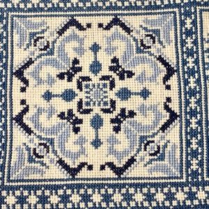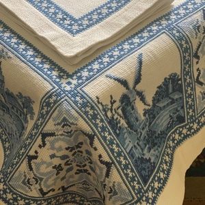 Vintage tablecloth delft blue with windmill and country scenery emboidered in cross stich along the botton edge with 5 napkins. There is faint stain on white part, not really visible. Please see last two pictures.