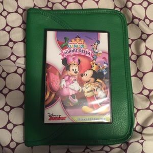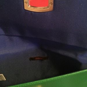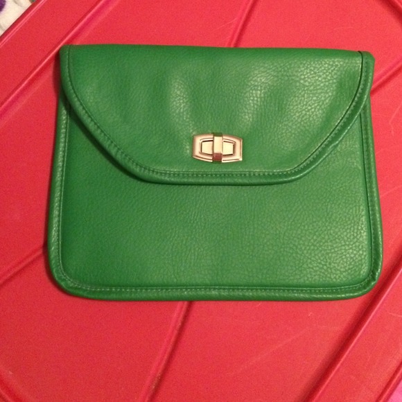 This is a fake leather tablet case. Can fit an iPad or a kindle with extra space. It is green on the outside and purple inside. Cloth lined. Has a twist lock in gold closure. Very fashionable. Brand is Mark by Avon probably could be used as a clutch of sorts. Brand new. Never used. Last photo is to show size.