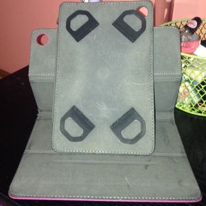 Pink and gray tablet case. Includes stylus holder and straps that hold tablet. Rotational pad so you can switch the orientation of your tablet.