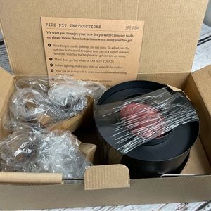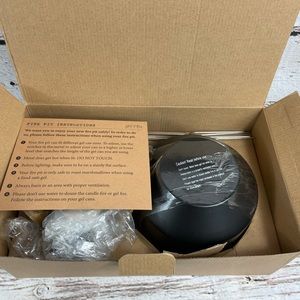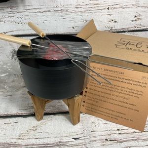 NO FUEL IN THE BOX; fire pit, rocks, stand & marshmallow skewers included