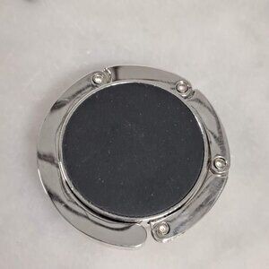 This handy handbag holder fits over a tabletop and will keep your handbag off of the floor. Unfold the "arm" and place the round part on the top of the table (there is a rubber piece on the bottom to protect surfaces and reduce slippage), let the "arm" hang off of the table and place your handbag handles on the arm. Easily folds up again when finished and stays closed with magnetic closure. The top has an orange and gold mosaic look that is covered in clear resin. Comes in a blue drawstring bag. Great to throw in your purse or give as a gift.