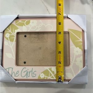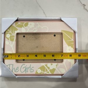 Decorative tabletop picture frame, with "the girls" in nice writing in the bottom. Peachy and light green color. Holds a 4" x 6" photo. Please see photos for overall size of frame. So pretty and perfect for sisters, best friends, or children.