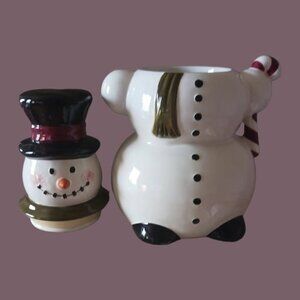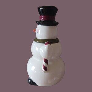 Tabletop unlimited snowman cookie jar white black color 14.5tall×8W The snowman wears a hat and a scarf and in his hand holds a candy cane brand new without box from smoke and pet free home.0764.