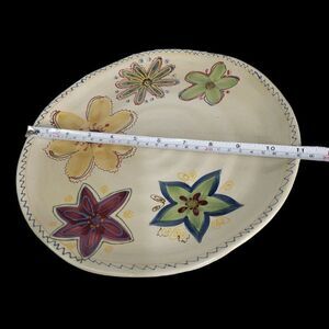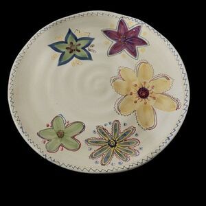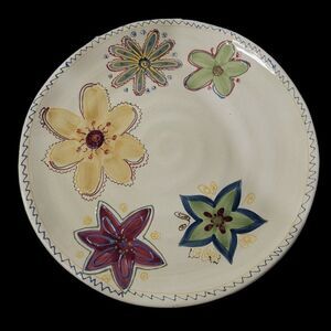 Beautiful multicolor floral, tan band, no trim, painted flowers. This collection has been discontinued. There is a small crazed on plate please photos for details on condition. I love this plate it has all the happy colors, shapes and textures. Perfect to add to your home decor.