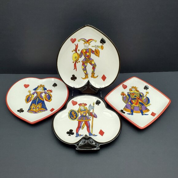 Tabletops Gallery King of Hearts Appetizer Snack Plates - Set of 4. Excellent pre-owned condition, approximately 8" to 8.5" on average. Very cute snack set for your next poker party or game night. Queen of Hearts, Jack of Clubs, King of Diamonds and the Joker on a Spade-shaped plate.