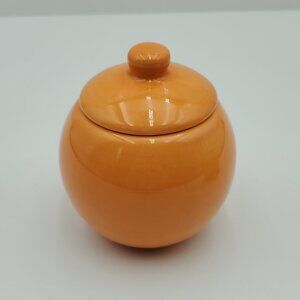 Tabletops Gallery Playa Orange Creamer and Sugar Bowl with Lid. Very good pre-owned condition - purchased in the box (box not included) but I see a slight crazing line on the bowl upon up close inspection. The color is close to a creamsicle orange. The set is small with the creamer measuring 3" tall, 3.5" wide, 4.75" handle to spout. The sugar bowl is 2.25" across the opening, 3.75" tall overall and 3" wide. Cute little set in a cool color!