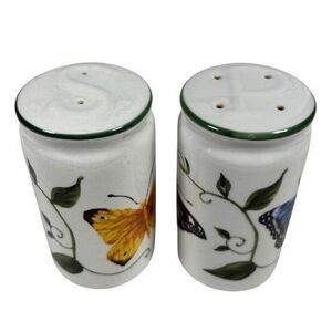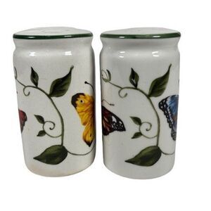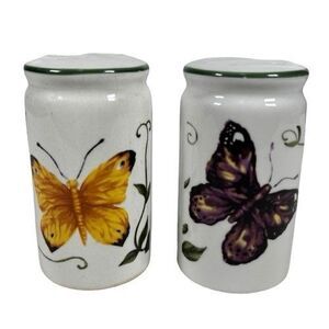 Tabletops Unlimited Spring Garden Butterfly & Vine Salt Pepper Shakers Cottagecore. Yellow, Blue, Orange, and Purple Butterflies with a Green Vine. Both have the original stoppers. Preowned condition. No chips or cracks. Comes from a smoke and pet free home. Please see pictures for more details.