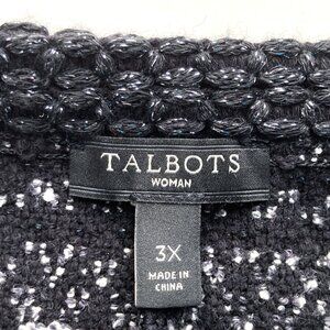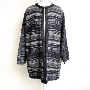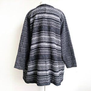 Sparkle even more than usual in this knit tweed open cardigan jacket with front pockets and braided trim. Black with silver metallic threads (pics don't show the shimmer). Mostly cotton.
