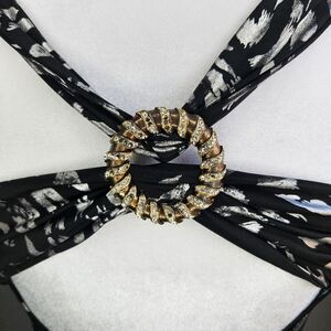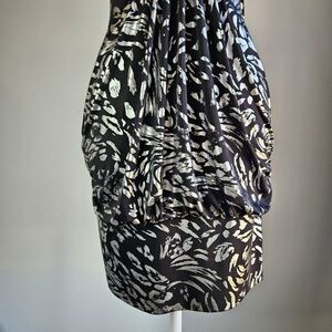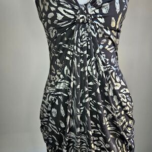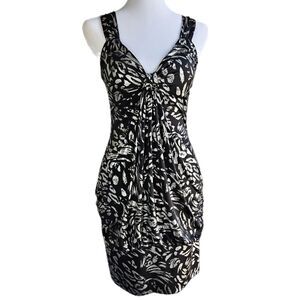 Stretchy form fitting dress from Taboo. V-Neck babydoll bust with ruching. Strappy details in the back. The fabric is sleek and super stretchy with metallic animal print.