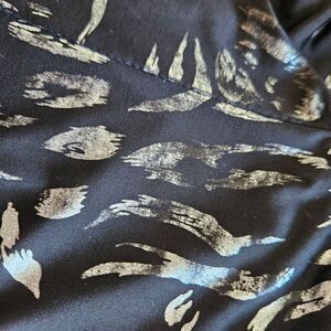 Condition: Size and care tag is missing. The metal buckle detail in the back is missing some rhinestones. The silver print is fading a bit in spots. See last 3 photos for details.