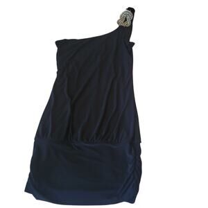 Made of polyester with a solid black color and rhinestone accents in the shoulder, this dress features a one-shoulder design and a pullover closure for easy wear.