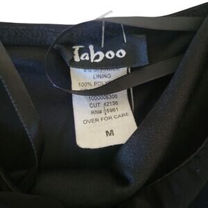 The size says medium, but according to the measurements, it will fit sizes small to medium due to the spandex in the fabric. Made in the USA by Taboo in the earliest 2000.