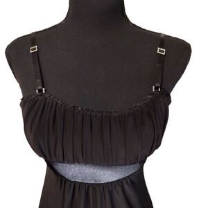 Black mini dress with adorable jeweled details on straps. Top of the dress is ruched with a cute ruffle on top. Lightly padded. Dress is 28" long from center of dress to bottom and 34" from top of straps to bottom. Brand new with tags. Size small.