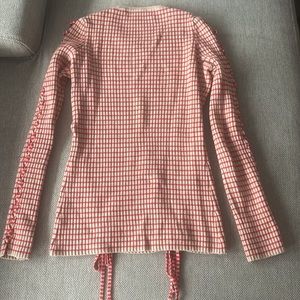 Cool sweater with tie up both arms and down the from on both sides. 94% wool, warm