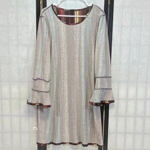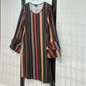 Long Ruffled Bell Sleeve Scoop Neck Stripe Fleece Shift Dress from Tacera. Lovingly worn – looks in excellent condition. Relaxed sheath silhouette in soft warm black, burgundy and gold vertical stripe fleece knit. Scoop neck with narrow self band. Long bell sleeves with wide ruffle at forearm. Hits just below knee. Dress it up with boots and statement jewelry for a night out or keep it casual with leggings and sneakers.