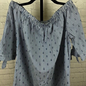 Tacera dress size large. Cute, off the shoulder style dress. Blue and white pinstripes with anchor print. Ties at the end of sleeves. New without tags. Smoke free home.