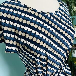 Tacera Sz S Tunic Dress Tie Belt Geometric Stretch Blue White Midi NWOT 0784